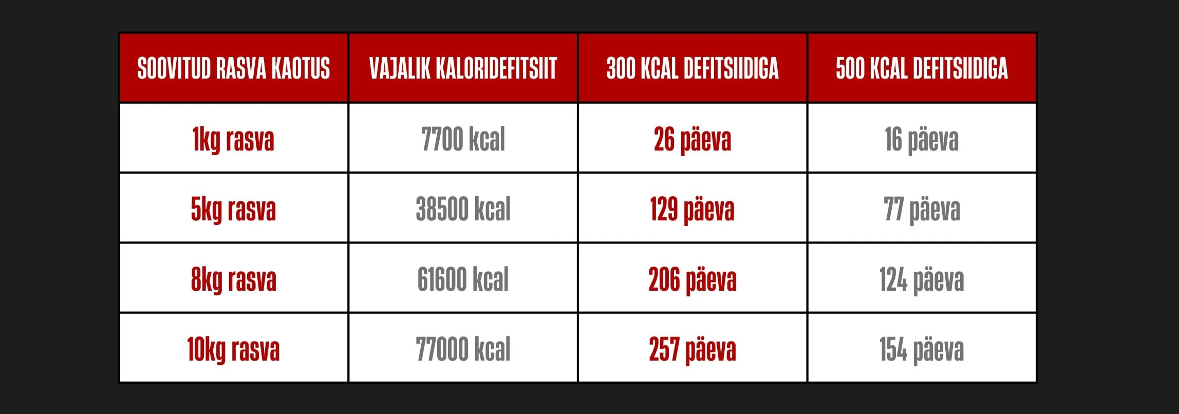 Teoorias vajab ühe kilo rasva kaotamine umbes 7700kcal defitsiiti. Loomulikult pole see nii lihtne, kuid ideaaltingimustes oleks erinevate rasvakilode kaotamise aeg umbes selline: