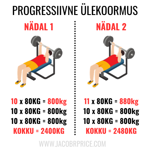 Pildi peal on kõige lihtsam näide mida on võimalik progressiivse ülekoormuse (progressive overload) kohta tuua. Oletame, et teed kahel järjestikusel trennil sama raskusega, sama tehnikaga, sama tempoga ja samades muudes tingimustes rinnalt surumist. Kui sa teed teises trennis ühe korduse rohkem, siis oled juba saavutanud progressiivse ülekoormuse.